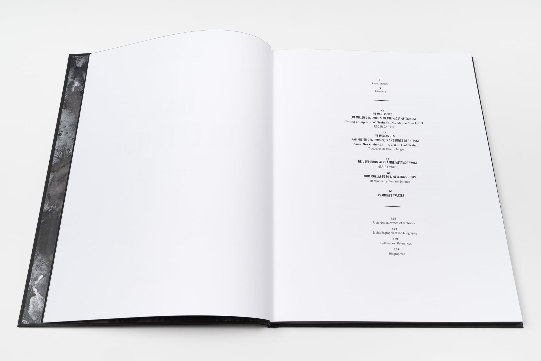 Carl Trahan. Das Gleitende — 1, 2, 3 focusses on a series of exhibitions presented between 2017 and 2019 at the MAC LAU and at Galerie Nicolas Robert. It includes two essays written by Roger Griffin and Marie Lavorel which take an original look at Trahan’s visual work and the themes developed in this trilogy. The texts have been translated into French and English by Colette Tougas and Bernard Schütze. Graphic design by Dominique Mousseau.