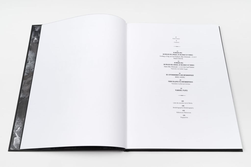 Cet ouvrage présente l’œuvre Carl Trahan, deuxième lauréat du Prix MNBAQ en art actuel. Ce prix bisannuel, décerné grâce à la collaboration de RBC Fondation, comprend une bourse de 10 000 dollars, une exposition et une publication monographiques, ainsi que l’acquisition d’œuvres à hauteur de 50 000 dollars pour la collection du Musée. Le livre comprend un essai d’introduction à la démarche de l’artiste (contenant une analyse des œuvres) écrit par Bernard Lamarche, conservateur de l’art actuel au MNBAQ, un riche portfolio mettant en vedette les acquisitions réalisées dans le cadre du prix ainsi qu’un très bel essai de nature philosophique écrit par Mathilde Bois de même qu’une liste des œuvres présentées et une biobibliographie de l’artiste. Il accompagne l’exposition organisée par le Musée national des beaux-arts du Québec et présentée du 6 avril au 24 septembre 2017. Le design est de Uniform (maintenant Principal) et a été récompensé par un prix Grafika en 2018.