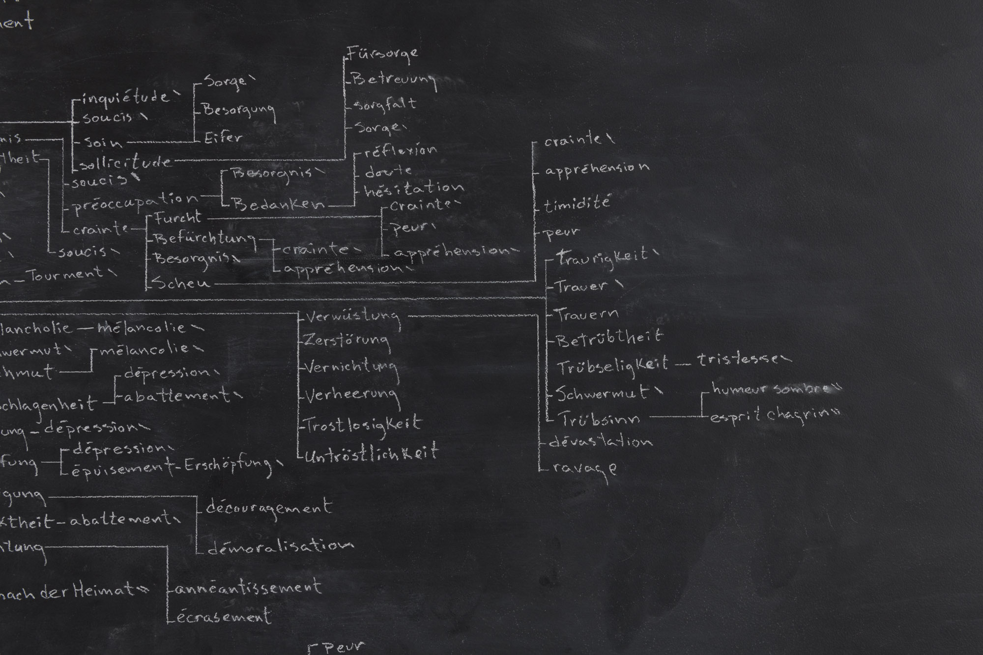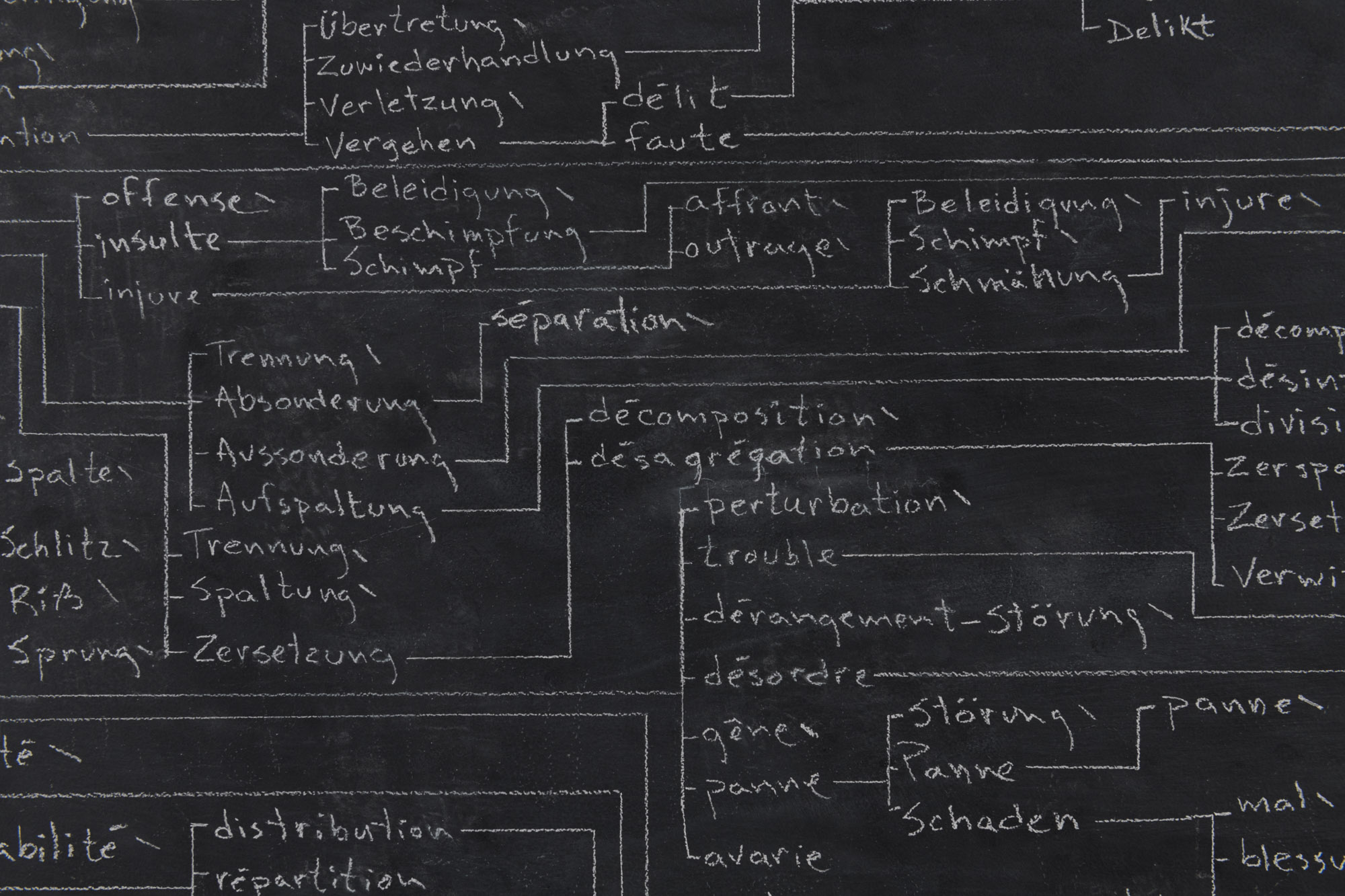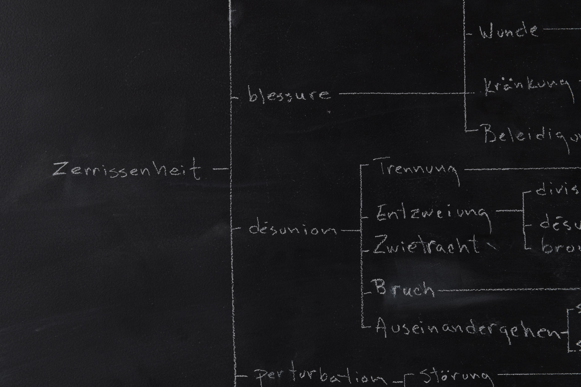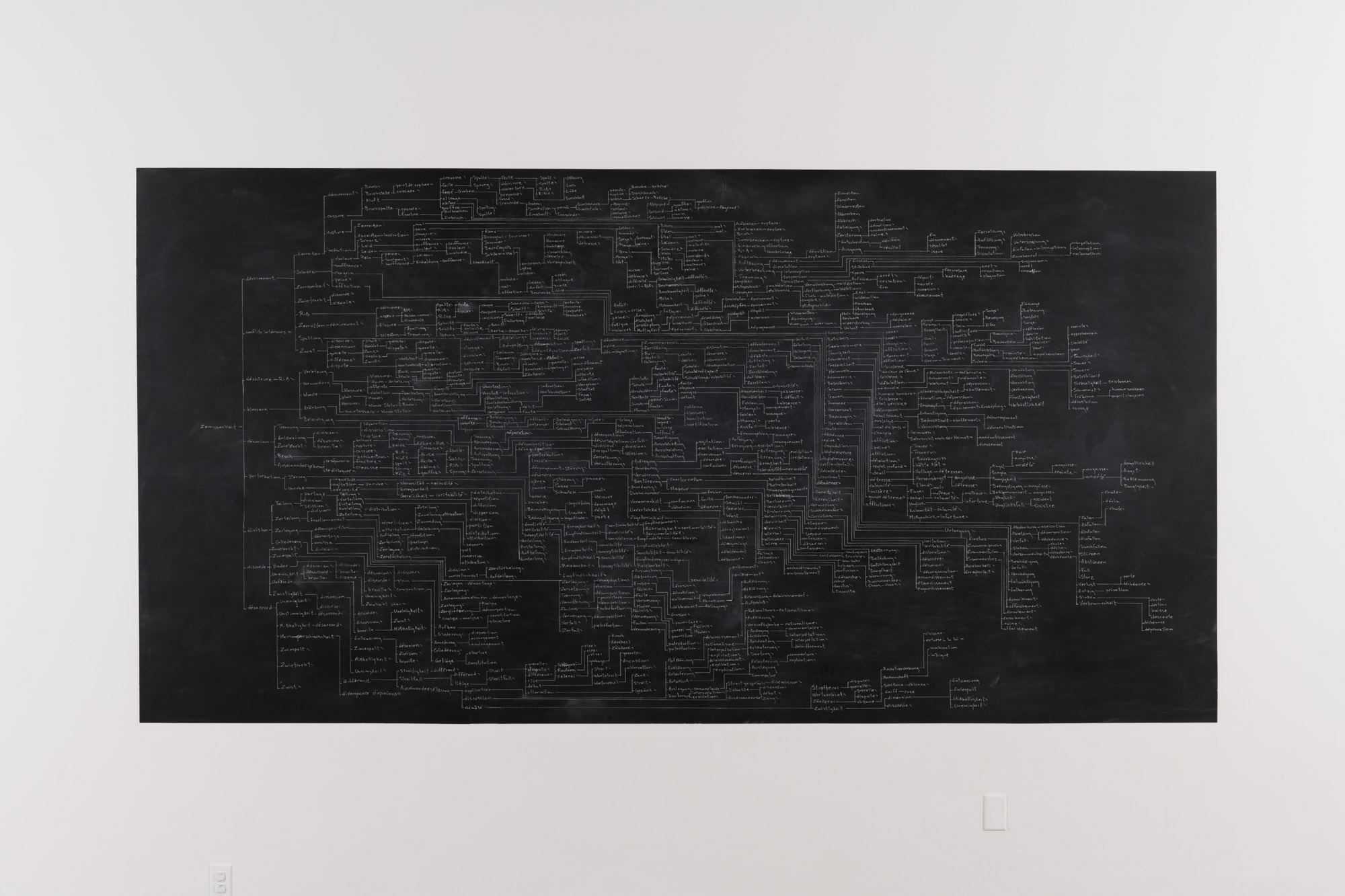 En prenant le mot allemand Zerrissenheit (le déchirement) comme point de départ, chacune des traductions françaises proposées dans un dictionnaire bilingue ont été transcrites. Pour chacun de ces termes, toutes les traductions allemandes ont ensuite été inscrites. Cet aller-retour — en principe infini — est maintes fois répété, jusqu’à ce que la limite de la surface soit atteinte.