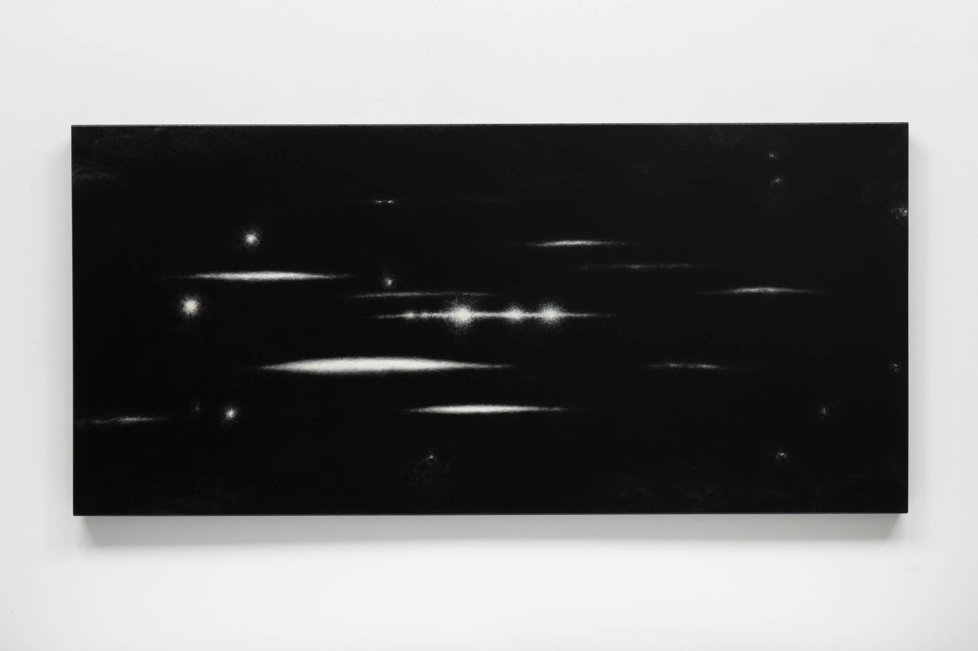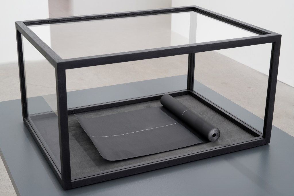 Graphite et peinture époxy sur aluminium, vitrine de verre, de noyer et de suède / Graphite and epoxy paint on aluminium, display case made of glass, walnut wood and suede, 33 x 62,2 x 45,7 cm, 2023
