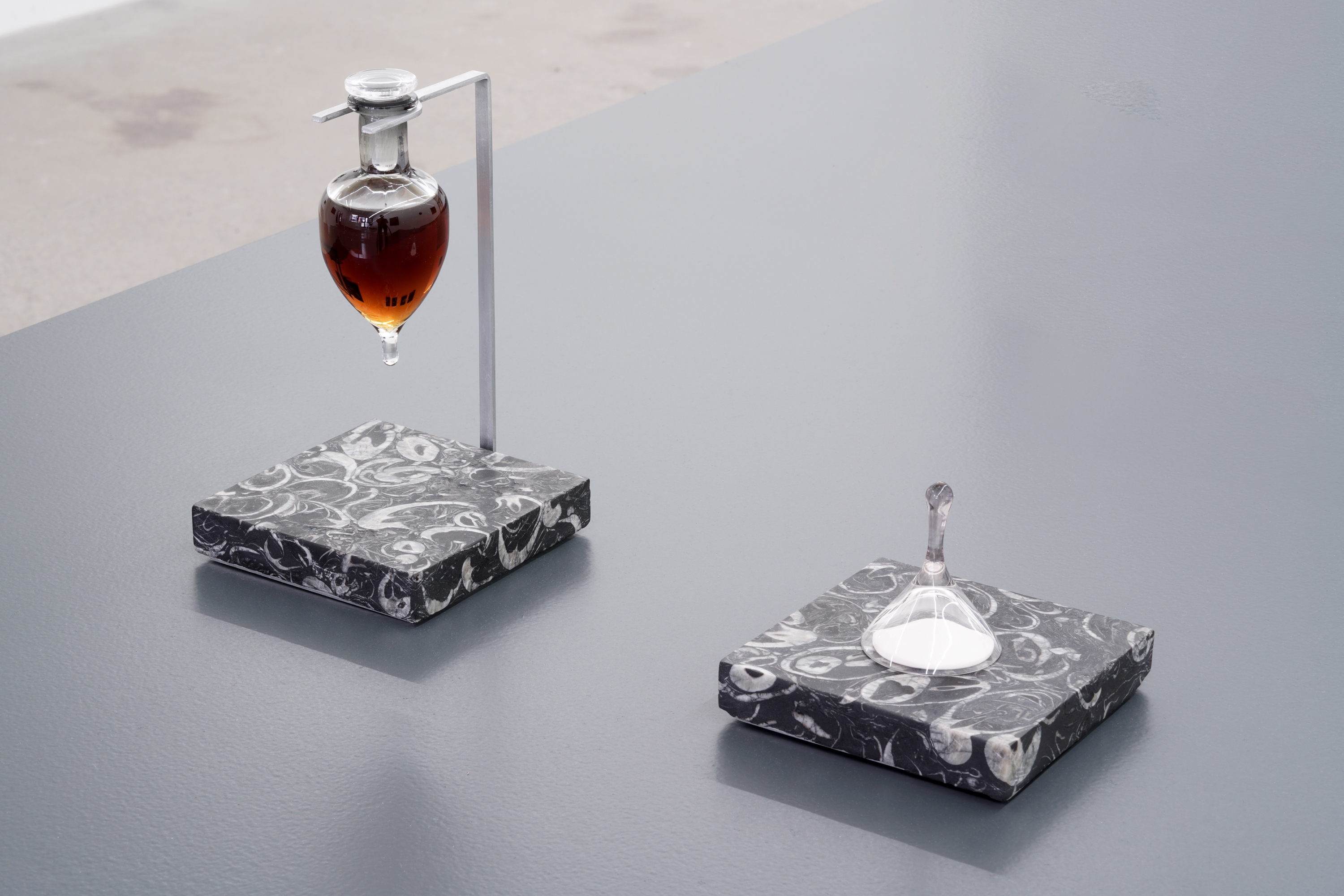 Parfum à base d’alcool dans un flacon de verre, cône olfactif de verre, porcelaine, marbre noir à fossiles blancs de Chine, aluminium / Alcohol based perfume in a glass bottle, glass olfaction cone, porcelain, Chinese seashell fossil black marble, aluminium, 2023